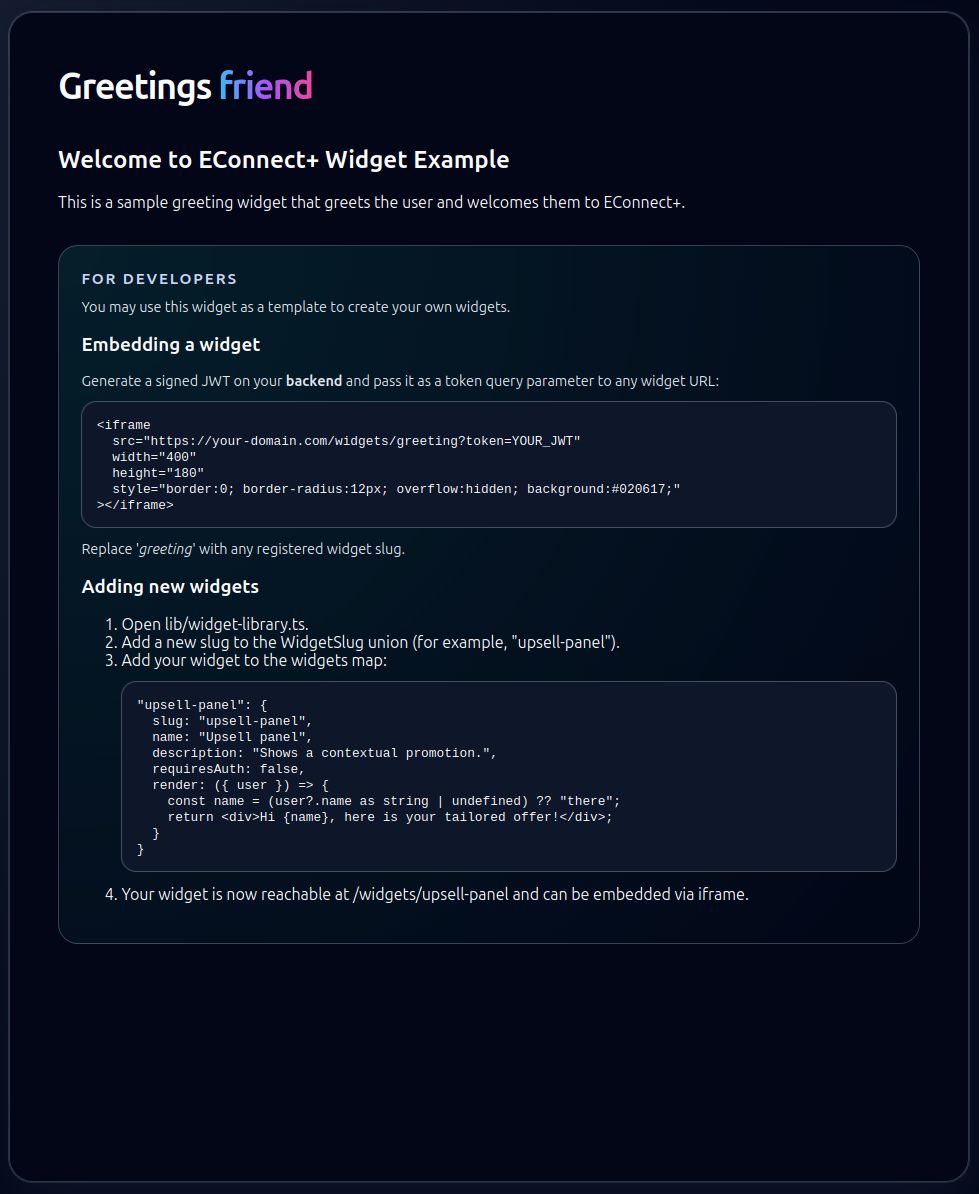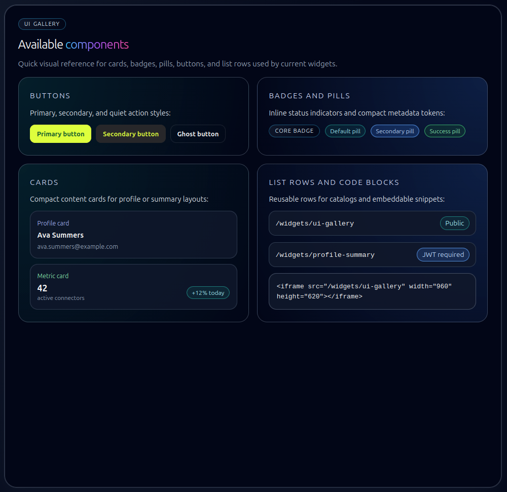 Each card represents a widget that can be embedded via iframe at /widgets/[slug]. Click through to see the live widget.